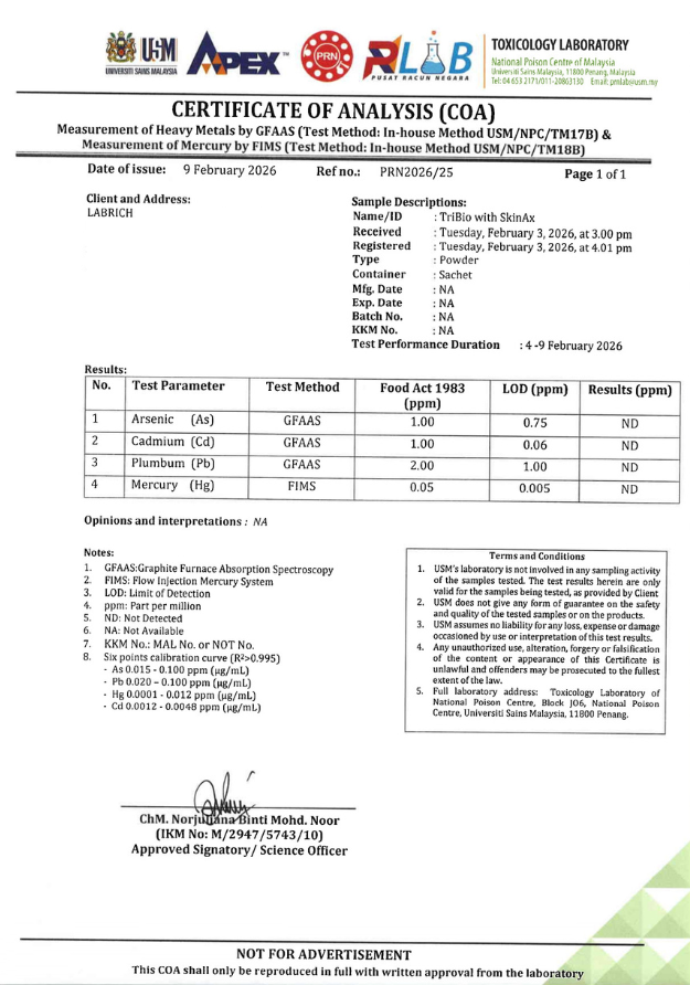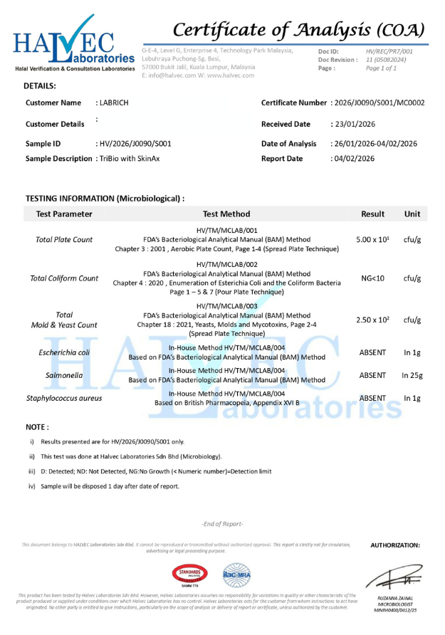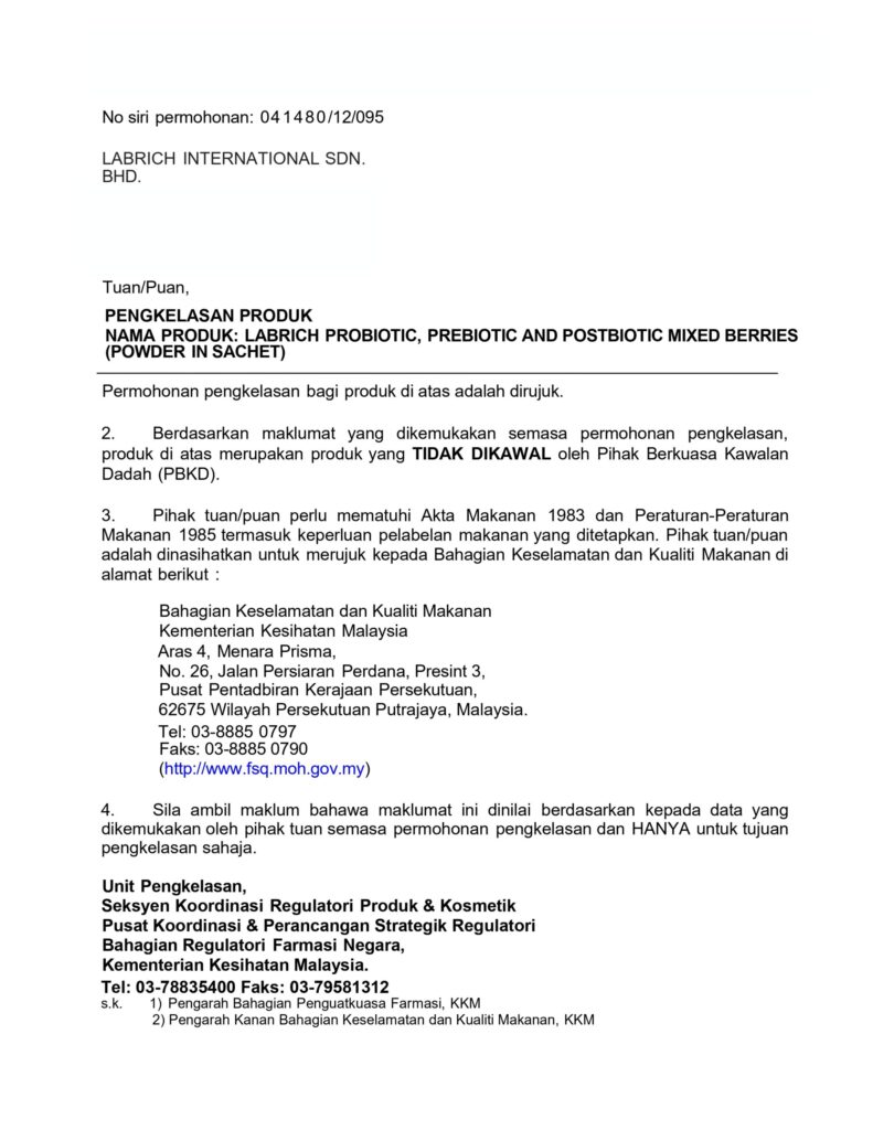 Labrich Tribio+ Skinax didaftarkan dibawah Pengkelasan Makanan & Tidak berfungsi sebagai Ubat