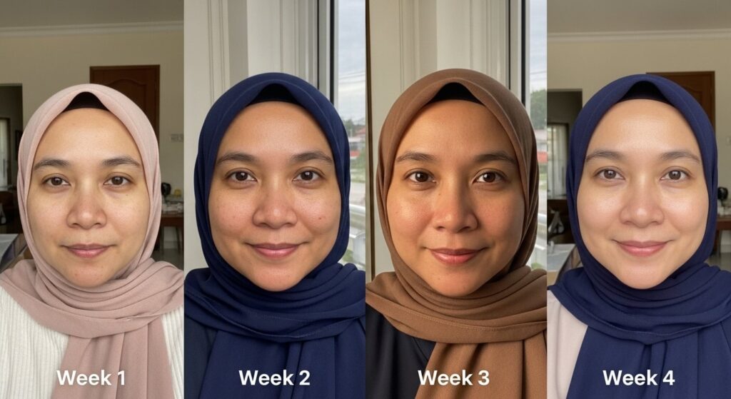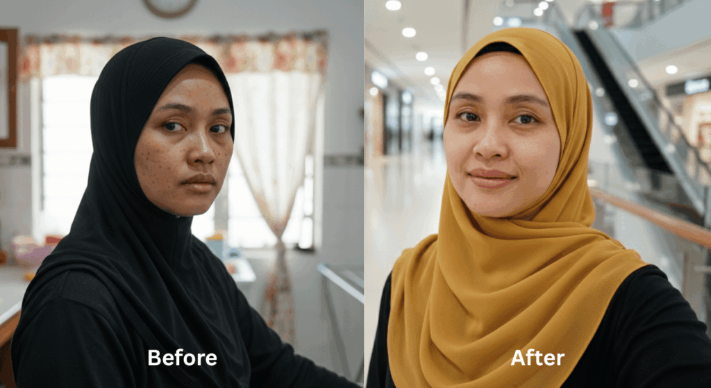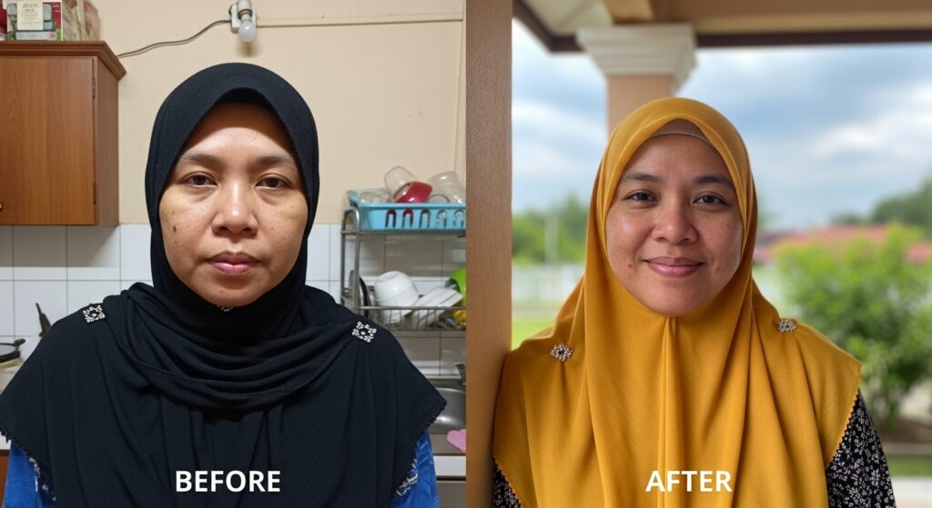 Kulit mula nampak lebih segar & kurang kusam. Tona wajah perlahan-lahan jadi lebih sekata.